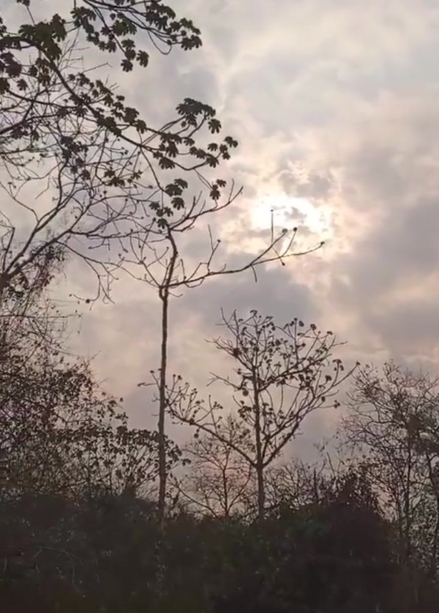 trees silhouetted against a cloudy sky with the sun shining through. The trees in the foreground are mostly bare, with a few still having leaves. Below the trees is a small hill covered in vegetation. The sky is mostly cloudy with patches of blue. In the middle of the frame, the sun is trying to break through the clouds. The camera is static throughout the video. The sound appears to be an animal calling.