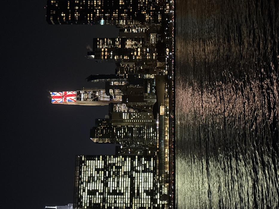 Illuminated cityscape at night, reflected in water. The towering buildings glow with myriad lights, some arranged in striking patterns. Notably, one structure displays the Union Jack. The dark water reflects the city's radiance, creating shimmering lines. The composition is balanced, with the built environment contrasting against the natural darkness of the sky and water.