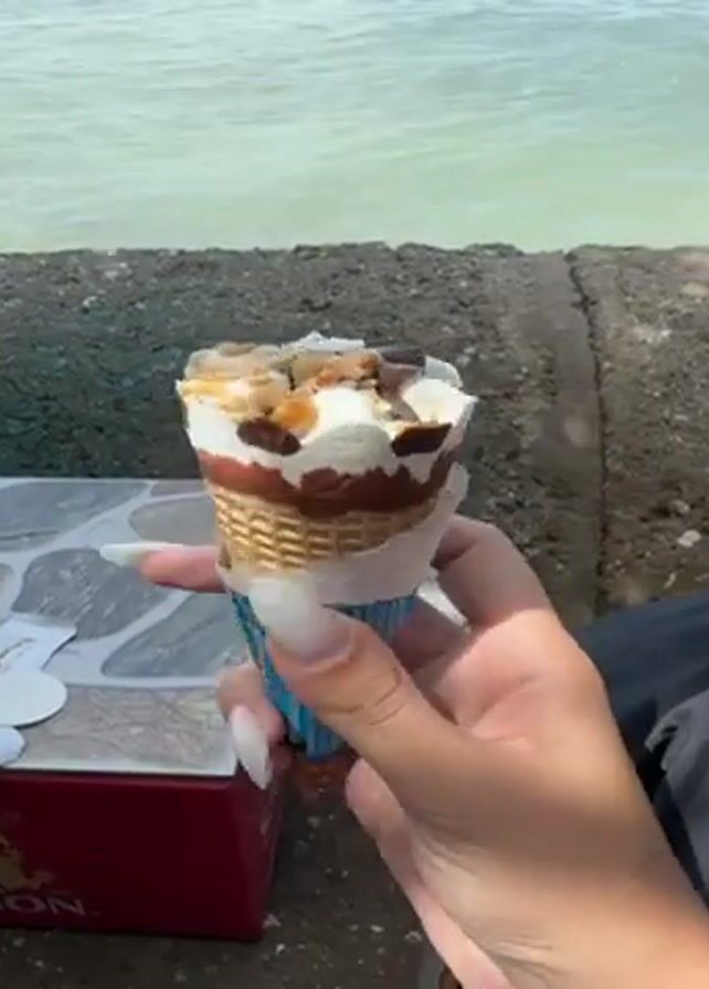 person holding an ice cream cone in front of an ocean view. The ice cream cone has a waffle cone, topped with vanilla and chocolate ice cream, chocolate syrup, and chopped nuts. The person's hand has long, light-colored nails. In the background, there is a red box with an indiscernible logo, a tiled surface, and a concrete wall. The ocean water is calm and a light green color.