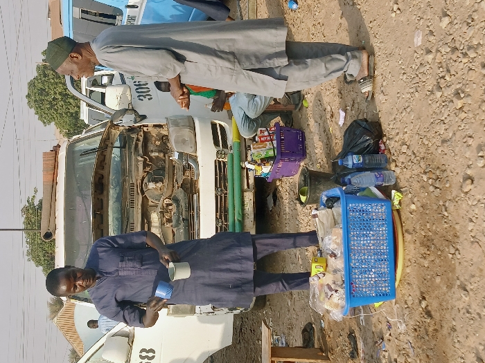 Two men stand near a white van with its hood open. One man in blue pours liquid from a container. An older man in gray stands beside the van's open engine compartment. On the ground nearby are assorted items including water bottles, a black trash bag, and blue and purple plastic baskets filled with goods. The setting appears to be an outdoor area with dirt and gravel.