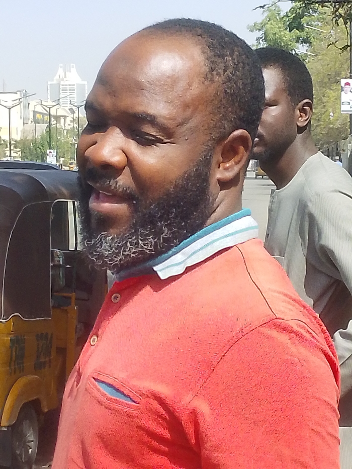 An adult male with dark skin, short dark hair, and a dark beard with visible grey hairs is positioned in the foreground, slightly right of center. He wears a coral-colored polo shirt featuring a collar with white and light blue stripes. His head is turned to the left, and his mouth is slightly open. Behind him, to the right, a second adult male with dark skin and short dark hair is partially visible, wearing a light grey traditional-style garment. To the left of the foreground subject, a yellow motorized tricycle (likely a Keke Napep) is partially visible. The background depicts a city street scene under bright daylight in Tarauni, Nigeria, featuring distant multi-story buildings, streetlights, and sparse green foliage.