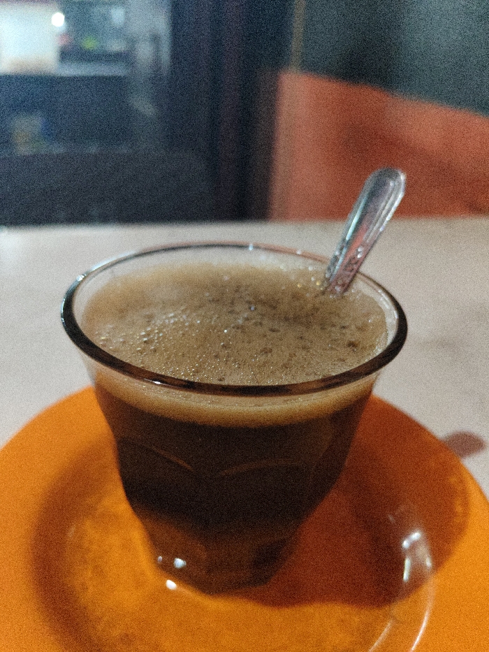 - "A high-angle, close-up photograph depicts a clear glass containing a dark, foamy beverage, likely coffee, situated on a bright orange circular saucer" by FM-bZrK33, licensed under CC BY 4.0