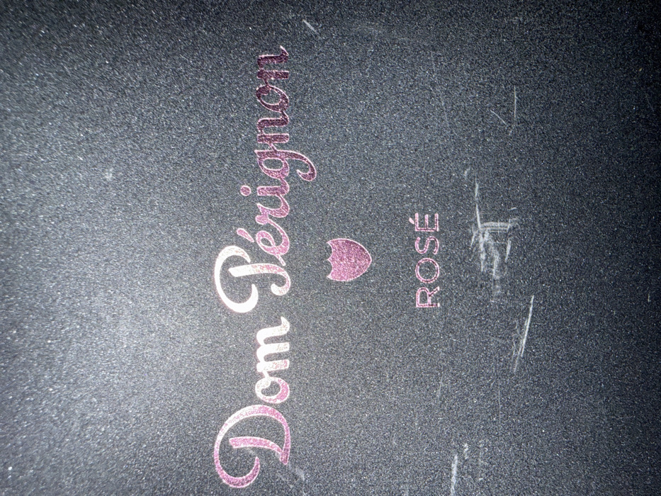 A close-up image depicts a dark grey, finely textured surface. Centered on this surface is the brand name "Dom Pérignon" rendered in a metallic pink, stylized cursive font. Directly below this, a metallic pink shield-shaped emblem is present. Further below the emblem, the word "ROSÉ" appears in metallic pink, uppercase sans-serif letters. The surface exhibits multiple light-colored linear scratches and scuff marks, predominantly in the lower half of the frame. Small particles or specks are also visible on the surface. No individuals or active events are depicted. The scene is located in the city of Crawley, United Kingdom.