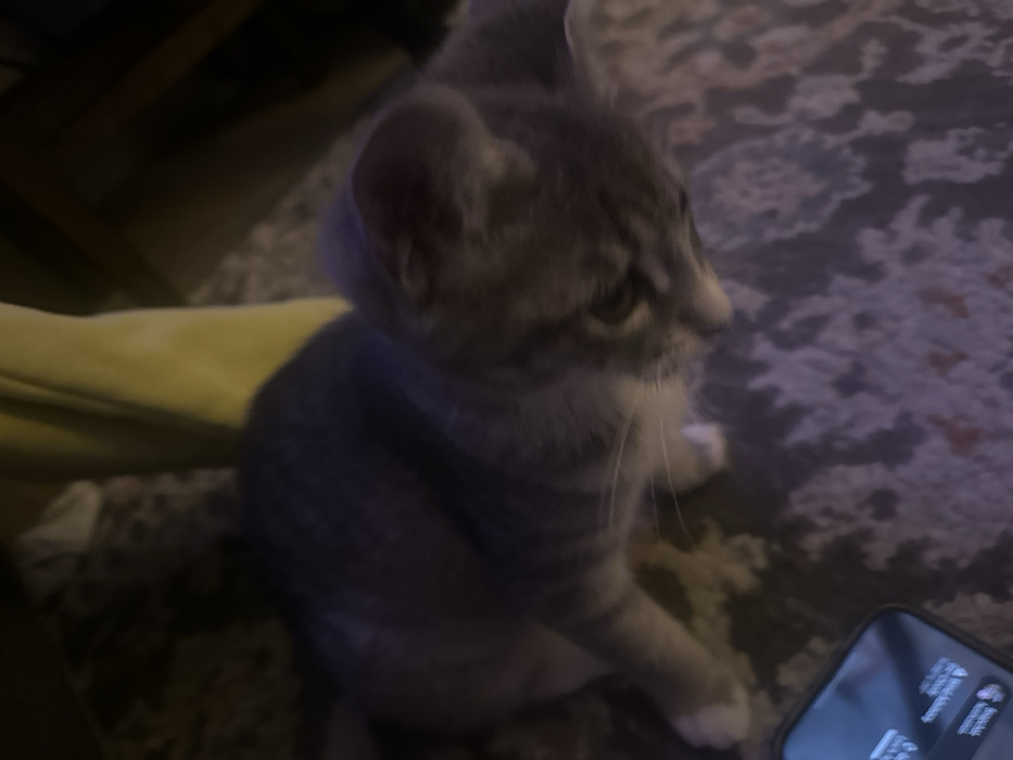 The scene is an indoor domestic environment located in Medford, United States. A gray tabby domestic shorthair cat, exhibiting white markings on its paws and muzzle, is positioned on a patterned rug or carpet. The cat's body is oriented diagonally across the frame, with its head lowered and gaze directed downwards and to the viewer's left. The rug features abstract or floral patterns in dark gray, purple, and beige tones. In the lower-left quadrant of the image, a smartphone with an illuminated screen displaying text or messages is partially visible. The background contains blurry elements, including a yellowish-green fabric item in the upper right. The overall lighting is dim. No human figures are present.