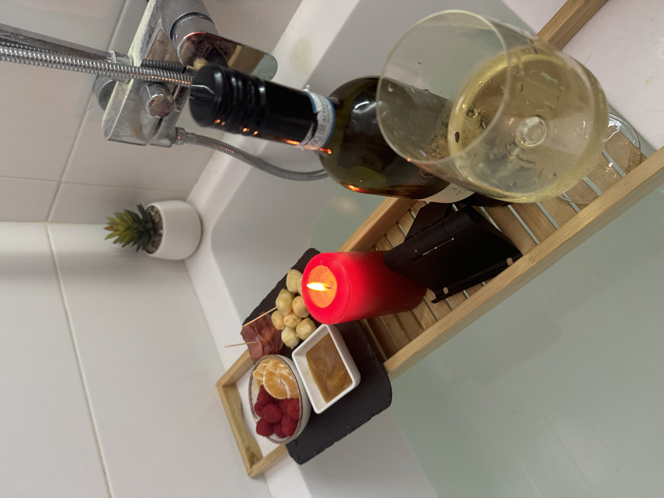 - "A wooden bath tray sits across a white bathtub, holding a bottle of wine, a filled wine glass, a red candle, and a small charcuterie board" by FM-j2hvk2, licensed under CC BY 4.0