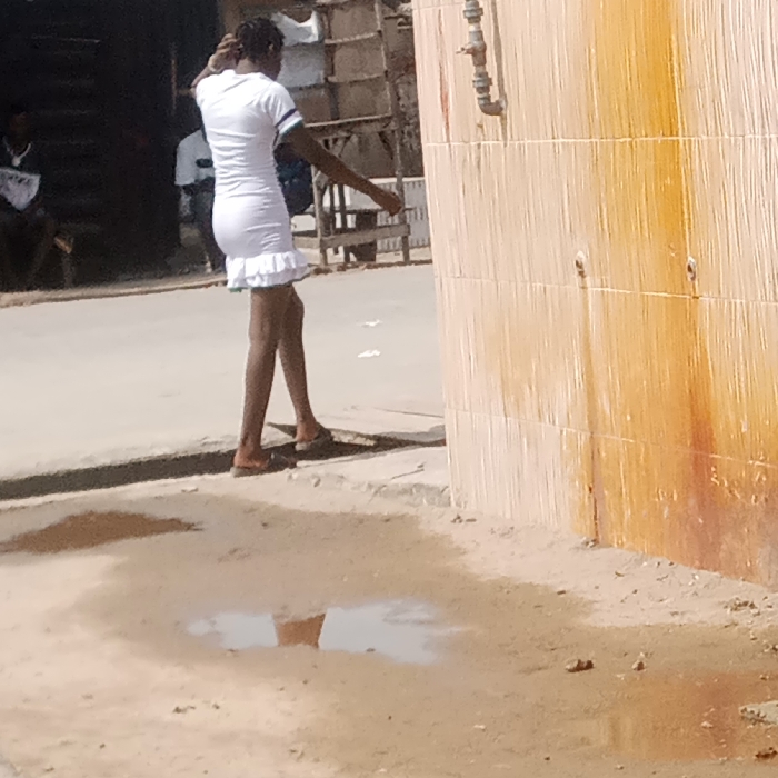This image captures an outdoor street scene in Ikorodu, Nigeria, under bright daylight conditions. The foreground consists of sandy-dirt ground containing a large, irregularly shaped puddle reflecting the sky and the lower half of the main subject. To the right, a vertical wall is constructed from light brown or orange-colored tiles, exhibiting prominent dark vertical streaks, indicative of water flow or staining. Two metal spigots or pipes are affixed to the upper portion of this tiled wall. The central figure, a dark-skinned individual, is shown walking away from the camera, positioned with their back mostly turned. They are wearing a short-sleeved white dress with a ruffled hem and dark striped details on the sleeves, along with light-colored sandals. Their left arm is raised towards their head. Their lower legs are visible, and their reflection is clearly present in the puddle. Behind the dirt foreground, a dark, narrow concrete curb or edge separates the unpaved area from a paved road surface. In the background, to the left of the main subject, two additional individuals are visible. One figure, wearing a dark top, appears seated or leaning against a dark background. Another figure, partially obscured, wears a lighter-colored shirt. Further in the background, indistinct structures, possibly market stalls or rudimentary buildings constructed from wood and other materials, line the street. The overall environment suggests an active urban or semi-urban setting.