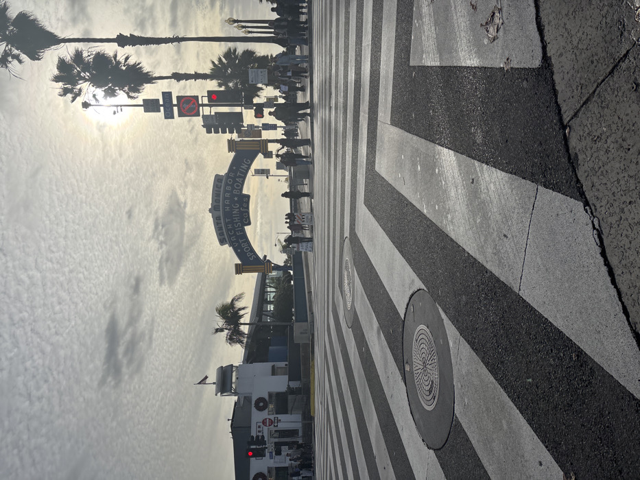 The scene depicts a street crossing in Santa Monica, California