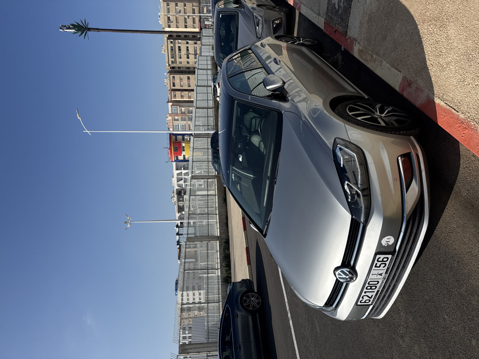 A silver Volkswagen Golf 7.5, bearing a Moroccan license plate "62180 | 56" and an "MA" country sticker, is parked curb-side on an asphalt road in Fez, Morocco. The car features a black panoramic roof and prominent LED headlights. To its immediate right, a grey Seat hatchback is also parked. Further left, a dark grey vehicle, possibly an Audi A7 Sportback, is visible on the road. The curb is painted with red and white stripes. In the mid-ground, a modern grey metal fence or barrier separates the road from other structures. Behind this fence, a complex of multi-story buildings with predominantly light brown facades is visible, along with a distinctive building featuring sections of white, red, and yellow. Two tall white streetlights illuminate the area. To the far right, a cellular antenna is disguised as a tall palm tree. The sky above is clear and blue. The scene depicts a modern urban environment, consistent with areas such as the Nouvelle Ville or the vicinity of the train station in Fez. No individuals are visible.