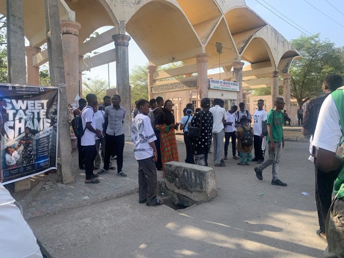 The image displays a daytime scene at the entrance of the College of Health Sciences, Federal University Lokoja, in Lokoja, Nigeria