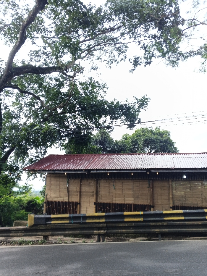 A single-story bamboo structure with a red corrugated metal roof stands beside a road with a black and yellow guardrail