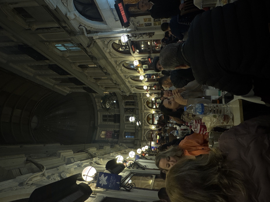 The image depicts a bustling nighttime scene within a historic, covered arcade in Beyoğlu, Turkey. Ornate, multi-story buildings with arched windows, balconies, and decorative facades line both sides of the passage, leading towards a large, dark domed roof structure at the far end. The environment is illuminated by numerous spherical light fixtures mounted on the building walls, along with several red, rectangular outdoor heaters. Signage on the left building includes a white sign with a blue lily and the text "Beyaz Zambak." The arcade is densely occupied by patrons seated at tables arranged along the passage, engaging in dining and social interaction. In the immediate foreground, the back of a person with light brown hair and a dark jacket is visible, facing away from the camera. To their left, a woman with blonde hair in an orange long-sleeved shirt is seated, looking downwards. To the right, a woman with dark hair, wearing a light-colored top, is seated with her hand near her chin, looking right. Further right, the back of a man with gray hair in a dark jacket is visible. Numerous other blurred individuals are seated at tables in the mid-ground and background, and a standing man in a dark jacket is present on the far right. Tables are laden with objects including various plastic water bottles (one labeled "Erkılı"), red-labeled soft drink bottles, small silver buckets, a white bag with "KARA BUĞDAY UNU" text, and glasses, some containing a milky white liquid. The overall scene suggests a lively restaurant or cafe environment within a grand architectural setting.