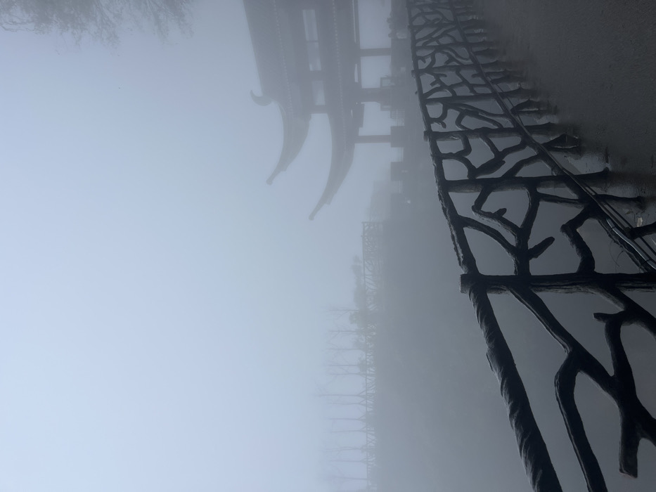 The image depicts a scene in Yongding District, China, enveloped in dense fog or mist, creating a monochromatic grey-blue palette. In the foreground, a dark grey railing, designed with an intricate, organic, branch-like pattern, extends diagonally from the lower left to the mid-right. To the right of the railing, a wet, dark grey paved pathway is visible. Immediately beyond the railing, the terrain drops off sharply, disappearing into the heavy mist, suggesting a cliff edge or deep chasm. In the mid-distance to the left, a line of indistinct, slender, vertical structures, possibly bare trees or decorative poles, are partially visible through the fog, situated behind another low barrier. To the right in the background, a traditional Chinese multi-tiered building with dark, curved, upturned eaves, resembling a pagoda or gatehouse, stands partially obscured by the mist. Supporting pillars and a dark base of this structure are discernible. Faint, indistinct human figures are minimally visible near the base of the building on the wet ground. The entire environment is characterized by extremely low visibility due to the thick atmospheric conditions, and all exposed surfaces appear wet.
