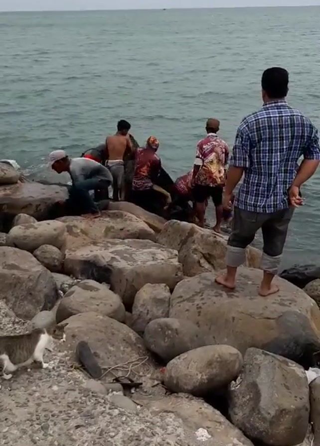 A group of men are gathered near the sea on a rocky shoreline