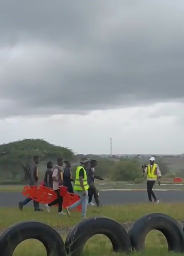 In a wide shot, a group of people, some wearing bright yellow vests, walk along an asphalt track, carrying a bright orange stretcher. The sky is cloudy and overcast. Tires are stacked in a row along the foreground, dividing the image from the track. A few trees and a radio tower are visible in the distance. The people walk from left to right. One person is filming them with a cell phone.