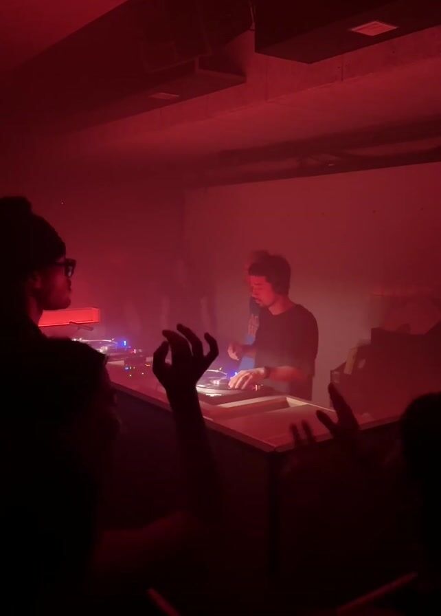 - "In a dimly lit, red-tinted room, two DJs perform for a crowd" by FM-tXV2B3, licensed under CC BY 4.0