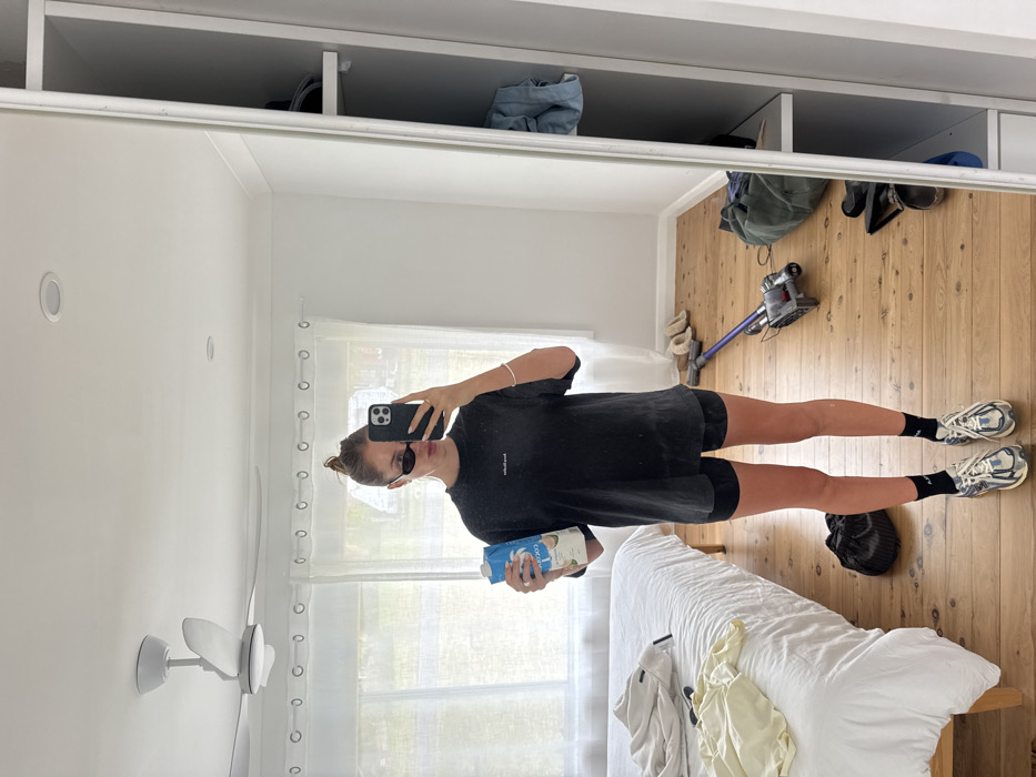 A mirrored view depicts a woman in a black tee and shorts, holding a carton of coconut milk. She wears sunglasses and trainers with black socks. The bedroom has wooden floors, a white bed with clothes strewn on it, and a Dyson vacuum cleaner. Overhead is a wardrobe with items stored on the shelves. A ceiling fan is visible. The reflection conveys a casual, everyday scene.