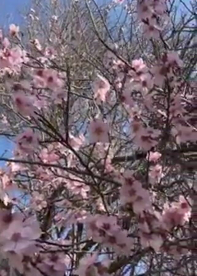 tree with pink blossoms against a clear blue sky. The branches are mostly bare, but are densely covered with pink flowers. The camera pans upwards, focusing on the blossoms and the sky. A dark fence is visible in the lower left corner of the frame.