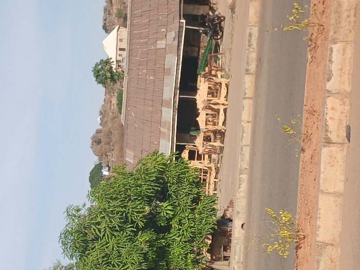 This image depicts a street scene in Bukuru, Nigeria. In the foreground, a paved road is bordered by a raised concrete median containing reddish-brown earth and two small, sparsely leafed plants. The midground features a large, dense green tree on the left. To its right, several ornate, light-colored wooden furniture pieces, resembling chairs or small benches, are displayed on a sidewalk. Behind the furniture, a long, single-story building with a rusted corrugated metal roof is visible. An open storefront reveals darker interior spaces. A dark-colored motorcycle is parked on the sidewalk near the right side of the building. The background is dominated by a rocky, arid hillside with sparse vegetation. A small, light-colored building with a conical roof stands on the hillside to the right, and other faint white structures are visible further left on the hill. The sky above is clear and light blue. No clear individuals are depicted engaged in specific actions.