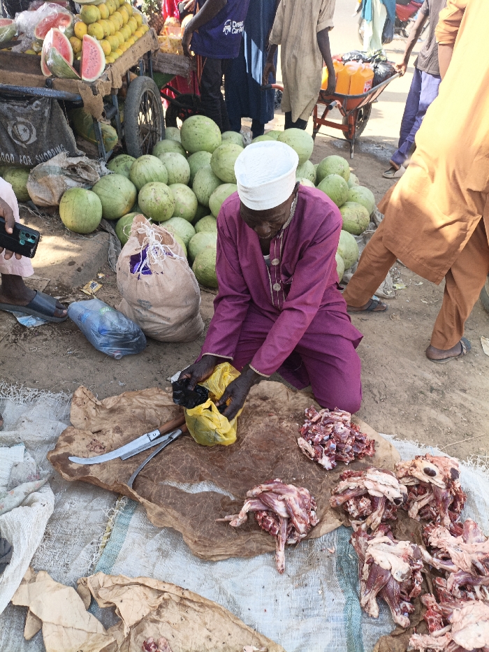 This image captures an outdoor market scene in Kawaji, Nigeria. In the foreground, an older male individual, wearing a purple long-sleeved garment and a white head covering, kneels on the unpaved ground. His hands are actively engaged with a yellow plastic bag, appearing to place an opaque, dark object inside or retrieve it. Before him, on a large, irregularly shaped piece of brown hide or material, are several portions of raw meat, some with bone visible. A large knife with a wooden handle and a pair of tongs rest on the material beside the meat. The hide is placed over a woven mat, which lies on bare earth. Behind the kneeling man, a large pile of green watermelons is stacked on the ground. To the left, a portion of a fruit cart with wheels is visible, displaying yellow fruits (possibly mangoes or oranges) and cut watermelons. A beige sack with a torn opening and a clear plastic bag containing other items are also on the ground near the watermelons. Further back, partially obscured individuals are present. One person on the far left wears light-colored clothing and holds a dark smartphone. Another figure on the right wears light brown trousers and sandals. In the background, additional market activity includes a person pushing a red wheelbarrow containing multiple bottles of orange liquid. The ground is unpaved, suggesting a dirt or dusty street environment under bright daylight conditions.