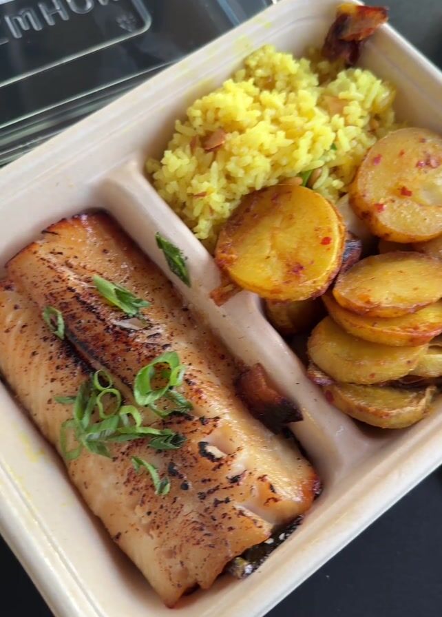 Here is a brief description of the video: The video shows a close-up shot of a takeout container divided into three compartments. The compartments contain grilled fish, yellow rice, and roasted potatoes. A white plastic fork pierces one of the potato slices. The container is sitting on a dark surface.