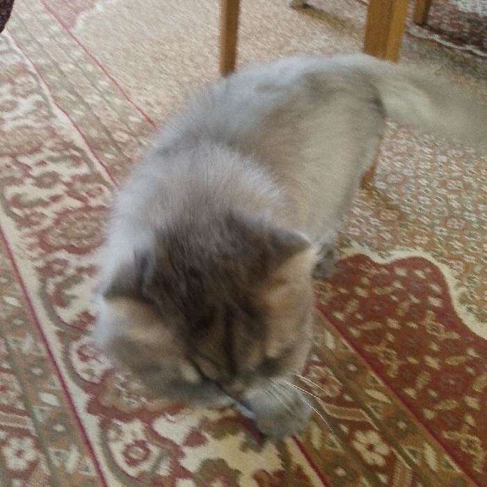 The scene is an interior view within a residential setting in Baghdad, Iraq. A domestic cat with medium-length, light gray and tan fur is positioned on a patterned oriental rug. The cat's head is lowered, directed towards the floor, with its white whiskers visible. The body of the cat extends diagonally across the frame from the upper left to the lower right. The rug features a repetitive design with cream, beige, and maroon elements. In the upper right background, two light-colored wooden furniture legs are visible, consistent with a chair or table.