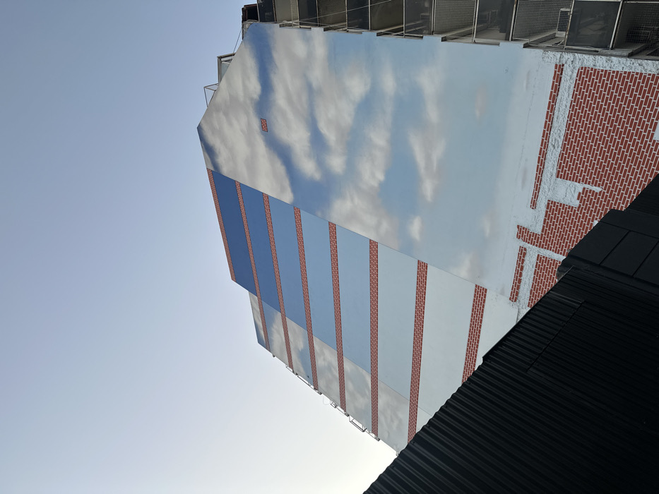 A low-angle shot shows a tall building against a pale blue sky. Part of the building features mirrored panels reflecting clouds. Other sections exhibit a vertical pattern of blue and white stripes bordered by brickwork. An adjacent lower structure with a dark, ridged roofline is visible in the foreground, adding depth to the composition. The angle emphasizes the height of the building and its blend of reflective and patterned surfaces.