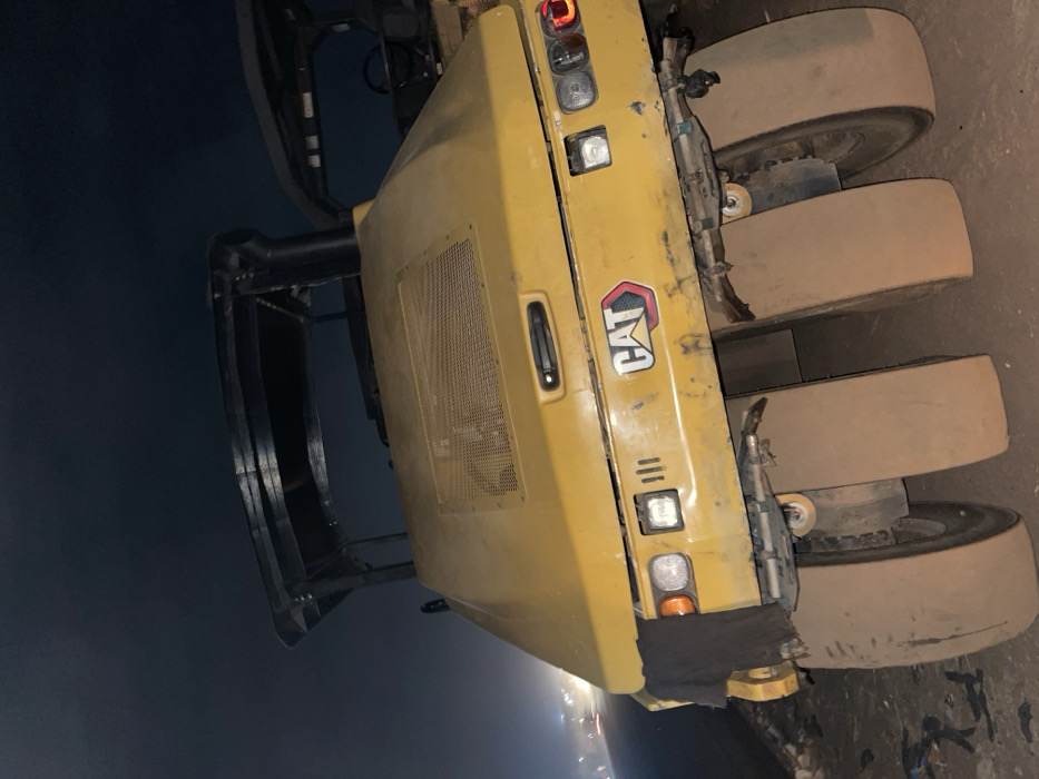 A yellow CAT construction vehicle is seen from a low angle at night. The front of the vehicle shows a protective roll cage, a screened vent, and a handle. The CAT logo is visible on the front panel, along with lights and a dark bumper. Four large, dusty tires are stacked in pairs on the right side. The background is dark, hinting at a roadside setting with some distant city lights.