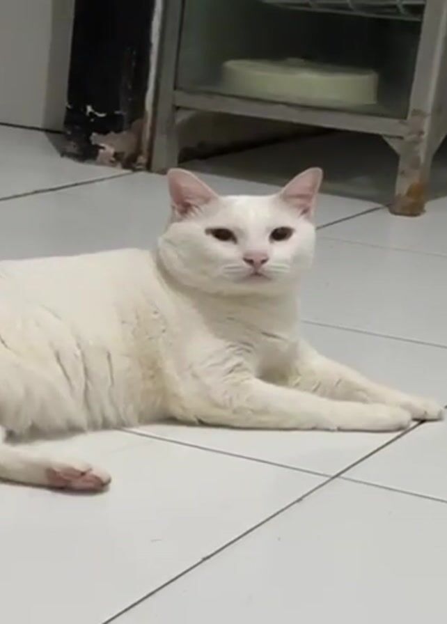 A medium shot captures a white cat lying on a white tiled floor