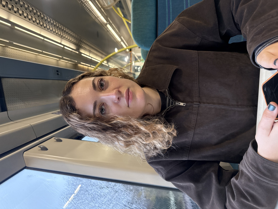 - "The image depicts a young adult female seated inside a moving train carriage, specifically identified as a Docklands Light Railway (DLR) train based on the distinctive yellow grab rails, ceiling design, and teal-blue upholstered seating" by FM-jCIl63, licensed under CC BY 4.0