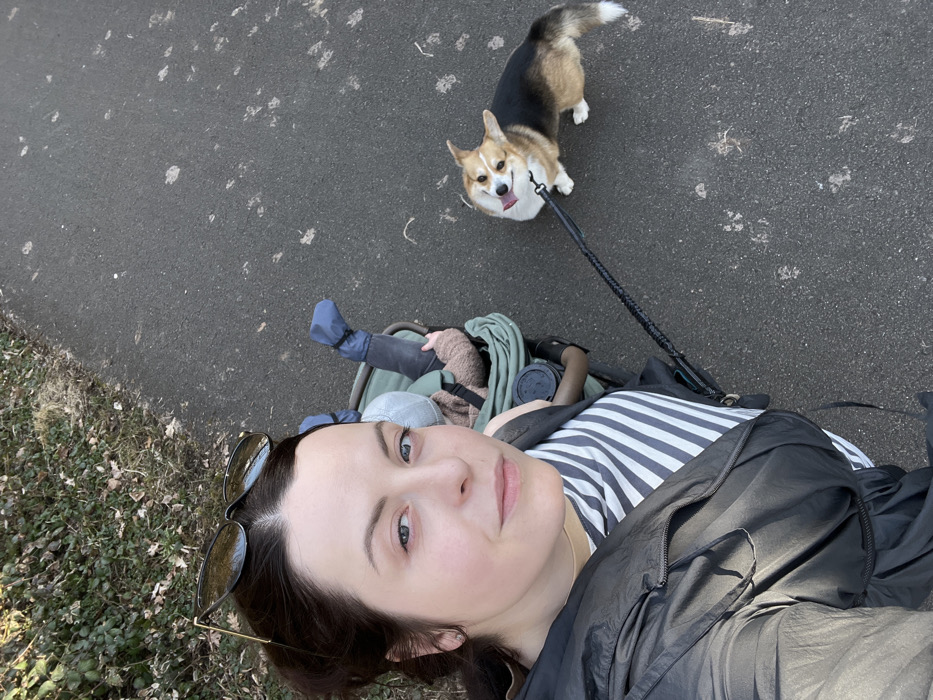 The image captures an outdoor scene in Meisenheim, Germany, featuring a woman, an infant, and a dog on a paved pathway. A Caucasian female, with dark hair pulled back and dark sunglasses resting on her head, occupies the left foreground, looking directly at the camera. She wears a horizontally striped top under a dark jacket. To her right, partially visible within a green stroller, is an infant, wearing a light-colored hat and blue foot coverings. A dark beverage cup is situated in a holder on the stroller's handle. To the right of the stroller, a tri-color Pembroke Welsh Corgi stands on the pathway, tethered by a dark braided leash, looking upward with its mouth open and tongue slightly extended. The leash extends towards the lower-left, connecting to an unseen point near the woman. The ground is a dark gray paved surface with scattered light-colored debris. Along the left side of the pathway, a bank of sparse, dry vegetation and bare branches is visible.