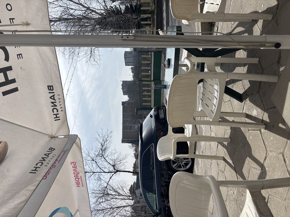 The image depicts an outdoor seating area, likely part of a café or restaurant, on a sunny day in Kardzhali, Bulgaria