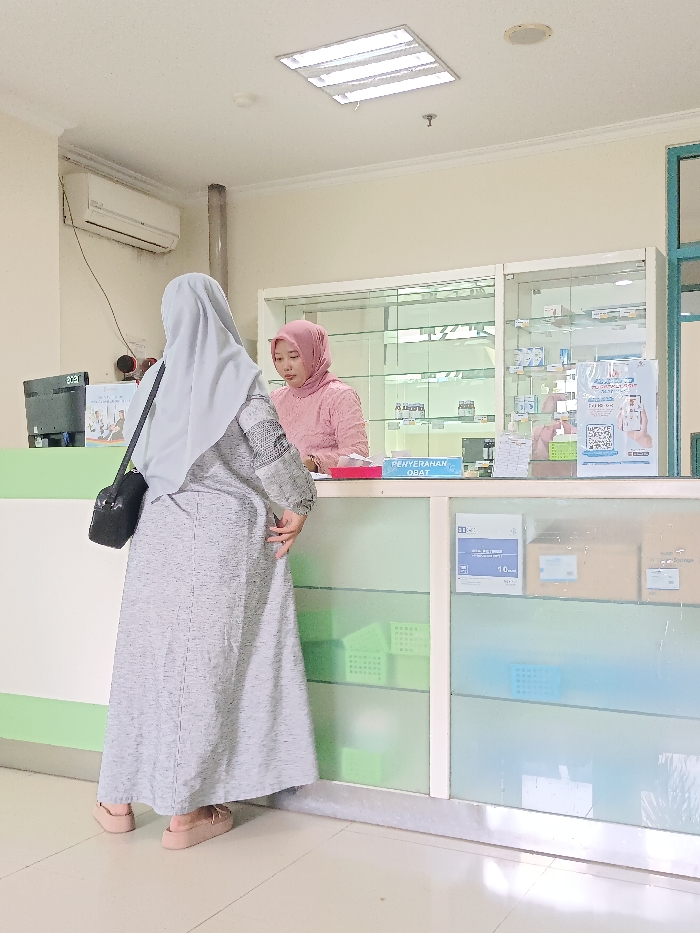 The image captures an indoor scene at a medical facility or pharmacy in Margorejo, Indonesia