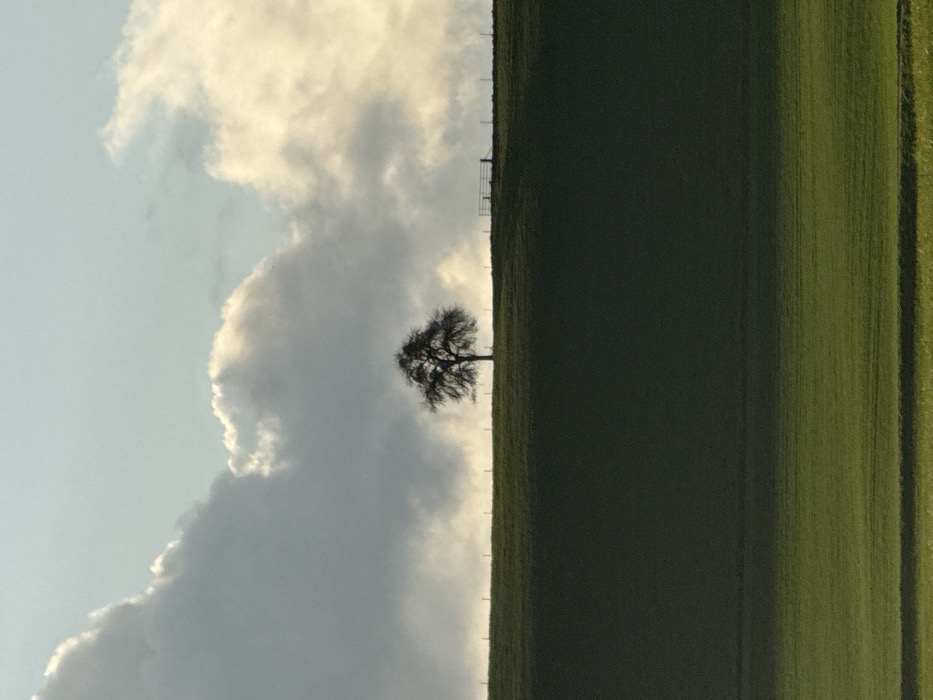 The scene depicts a rural landscape near Grevenmacher, Luxembourg. The upper portion of the frame features a sky dominated by large, textured cumulus clouds, predominantly dark grey with bright, sunlit edges, suggesting a backlighting condition. A clear, horizontal horizon line separates the sky from a gently rising landmass. Along this ridge, a single deciduous tree, bare of leaves, is silhouetted against the brighter sky, positioned slightly left of the frame's vertical center. A multi-strand wire fence runs horizontally along the ridge line, extending past the tree in both directions. To the right of the tree, integrated into the fence, is a dark, rectangular metal gate structure. The lower half of the image displays an agricultural field with a gentle slope, appearing dark green in the mid-ground and transitioning to a brighter, vibrant green in the foreground, indicative of young vegetation or crops. No human figures, animals, or active interactions are observed.