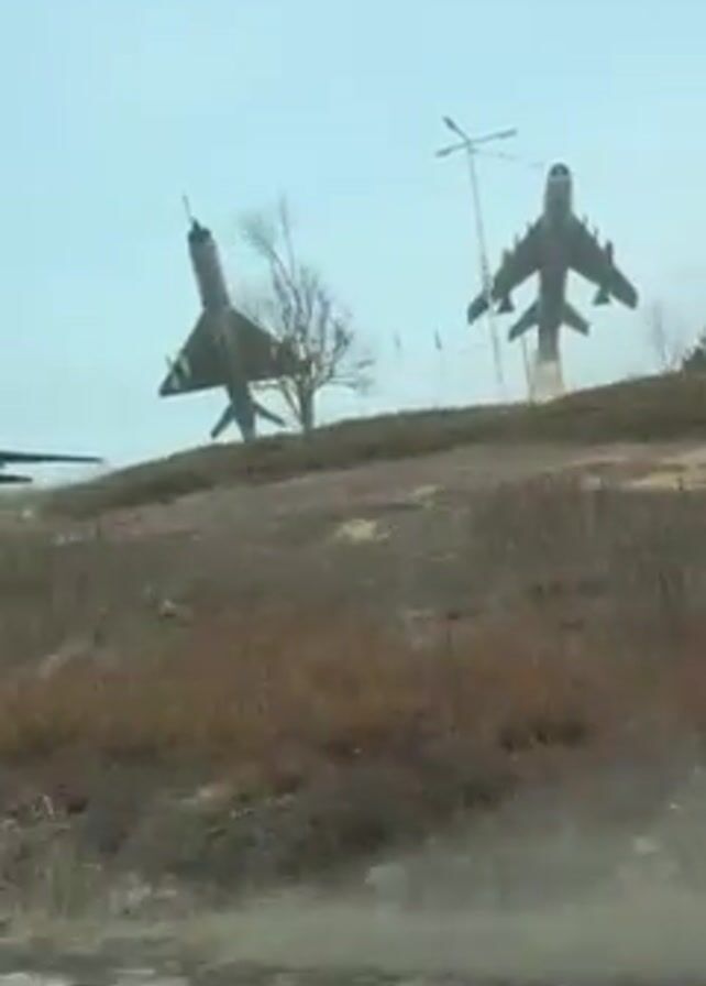 series of aircraft sculptures from the passenger seat of a moving car. The sculptures are mounted on posts on a grassy hill. There is at least one lamppost. The sky is gray, and the landscape appears to be rural. The vehicle's side mirror and window frame are visible in the foreground. The music in the background is fast paced.