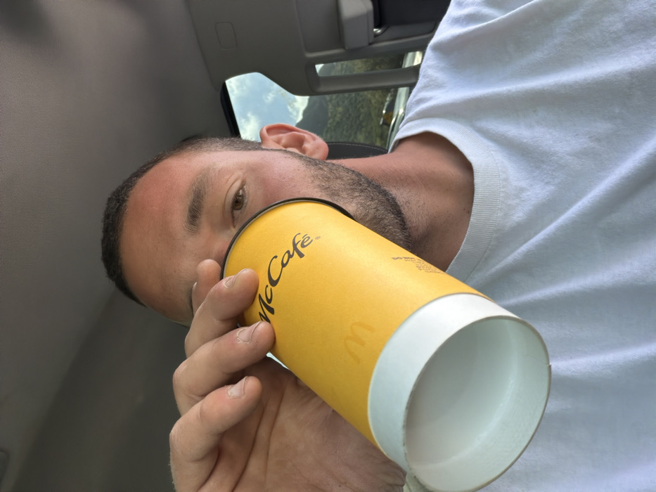 A male subject is depicted inside a vehicle, in what is identified as Agoura Hills, United States of America. He is seen consuming from a yellow McCafé branded paper cup, holding it to his mouth with his right hand. The cup is tilted upwards, suggesting it is being emptied, and the lid is absent. The subject has short, dark hair and a beard, wearing a white crew-neck t-shirt. A distinct tan line or sunburn is visible across his forehead. Through the vehicle's passenger side window, a mountainous terrain with green foliage under a blue sky with white clouds is visible in the background. The car interior features a light gray headliner and door panel.