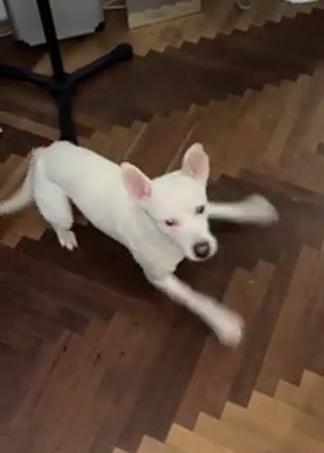 A short video shows a white dog on a wood parquet floor. The dog lies down, and the person filming gives it a command "Rядom!" (which may mean "next" or "nearby" in Russian). The dog gets up and runs to the person who is filming. The dog looks up from between the person's legs. The dog has two different colored eyes.