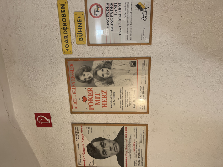 A wall exhibits theatrical posters. One features "Alice and Ellen Kessler in Poker mit Herz" (Poker with Heart). Another promotes "Der Neurosen-Kavalier" (The Neurotic Cavalier) starring Claus Biedderstaedt and Karin Dor. An emergency exit sign is also present. Two yellow directional signs, one for "Garderoben" (wardrobe) and the other for "Bühne" (stage), appear. The final poster advertises "Singendes Klingendes Land" (Singing Sounding Land) music festival, dated May 15-17, 1992, organized by the Baden-Württembergischer Laienmusikverbände (Baden-Württemberg Amateur Music Associations).