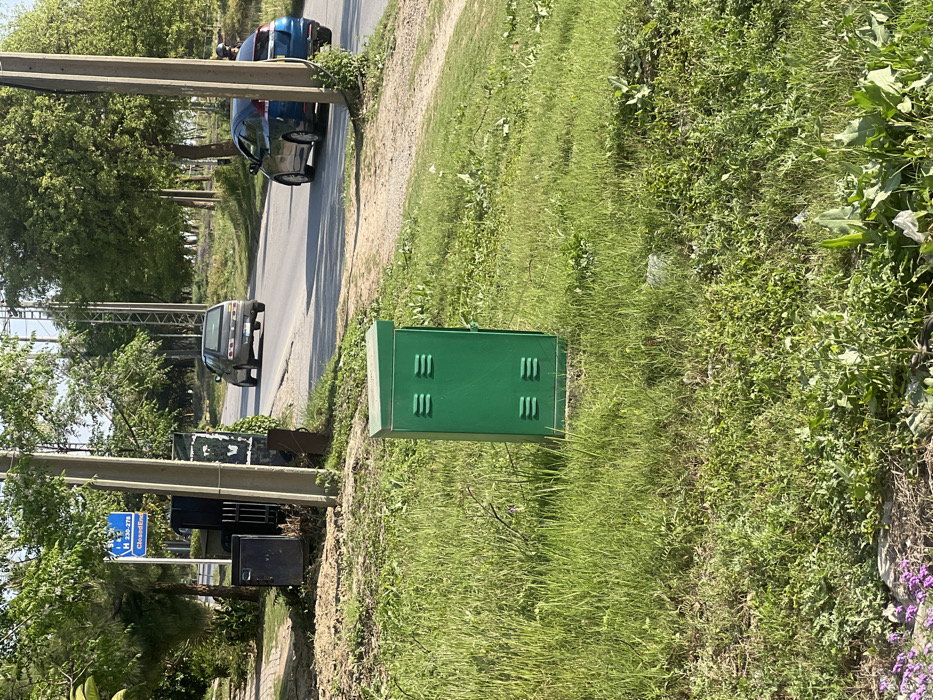 This image depicts a daytime street scene in Islamabad, Pakistan. In the immediate foreground, a rectangular green metal utility box with ventilation slits is centered on a patch of unkempt green grass, interspersed with weeds, some purple ground cover, and scattered white plastic debris. The midground features a paved asphalt road curving gently to the right. Two vehicles are visible: a light-colored sedan, possibly silver or light grey, seen from the rear, traveling away from the viewer, followed by a dark blue hatchback. On the left side of the road, a blue directional sign is mounted, displaying "H 230-270 Closed End" with an arrow pointing left. Beneath this sign and slightly to its right, a dark, taller utility cabinet with a metal grate sits near a concrete utility pole. Another concrete utility pole stands on the right side of the road. The background and areas surrounding the road are heavily vegetated with numerous trees and bushes, characteristic of Islamabad's green infrastructure. The sky is clear. No individuals are visible in the scene.