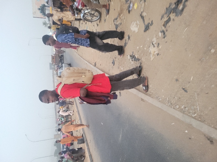 Two young men walk along a busy roadside. The man closest to the viewer wears a red shirt, dark pants, and sandals, with a tan backpack. The second man is wearing a blue patterned shirt with dark pants and sandals, carrying a backpack. The roadside is littered with trash. In the background, many people are gathered alongside cars and motorbikes, suggesting a bustling urban scene. The sky is overcast, contributing to a muted color palette.
