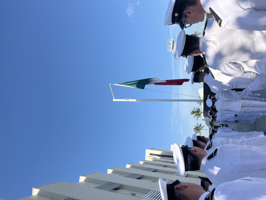 The image captures an outdoor formation of approximately two dozen individuals, predominantly viewed from behind, dressed in pristine white naval or maritime academy uniforms featuring white peaked caps and dark shoulder boards. They stand in structured rows on a paved surface, facing a prominent, tall white flagpole centrally positioned, from which a Mexican flag (vertical green, white, and red stripes) hangs. To the left, a modern, multi-story building with a light-colored facade and horizontal louvered window sections extends into the frame. Palm trees are visible in the mid-ground, and a multi-tiered metal observation tower is discernible in the distant background on the right. The sky is clear and blue with minimal cloud cover. This scene is located within the Heroica Escuela Naval Militar in Antón Lizardo, Veracruz City, Mexico.