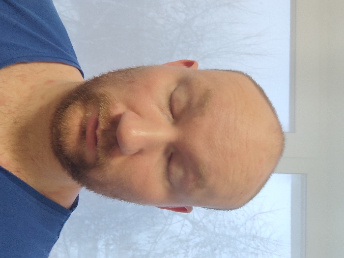 A fair-skinned man with a beard is captured in a close-up shot. He is wearing a blue shirt. His eyes are closed. A window with a view of trees is visible in the background. The image is slightly blurry and rotated.