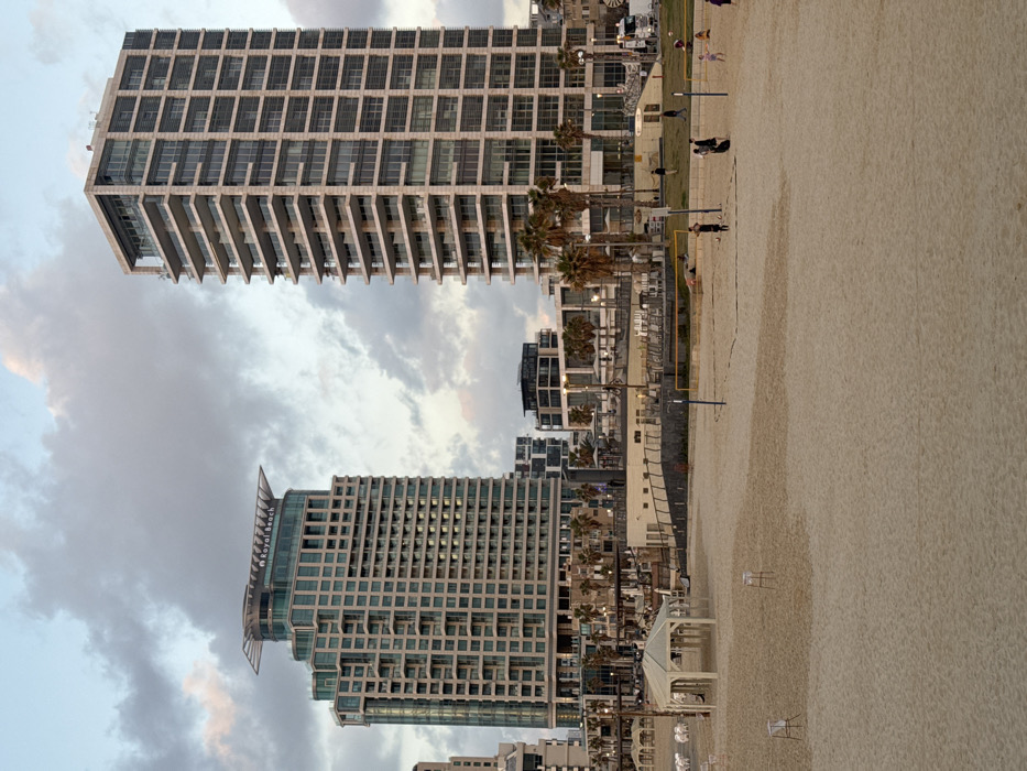 Two tall, modern buildings dominate the frame, juxtaposed against a cloudy sky and a sandy beach
