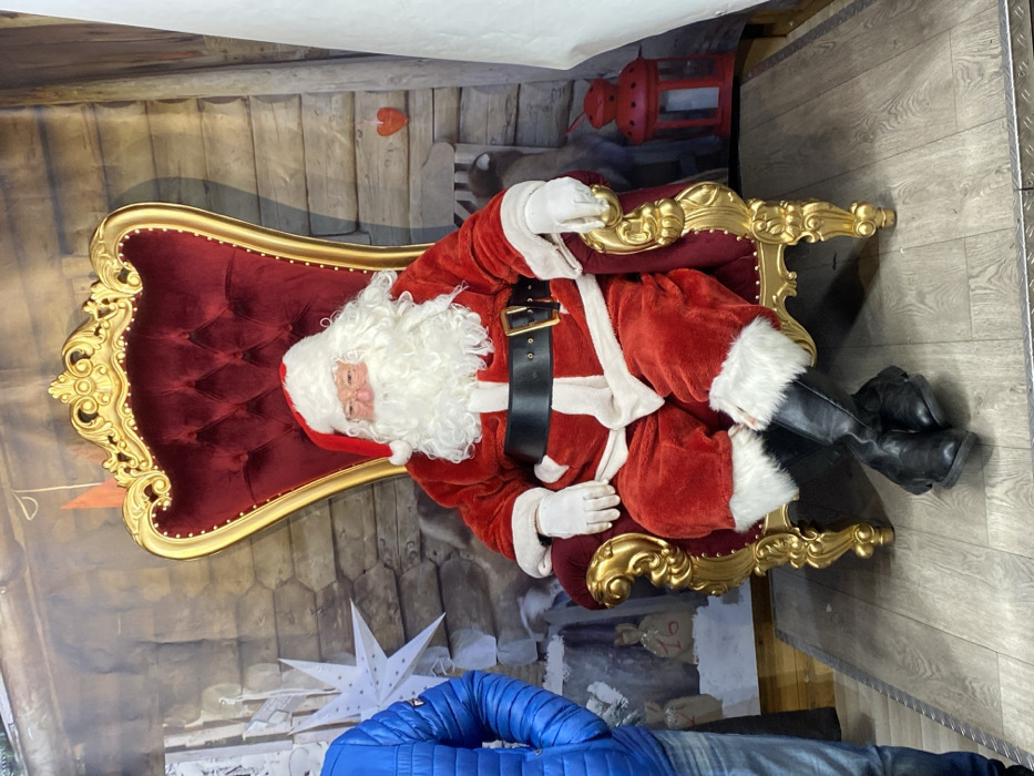 Santa Claus rests in a golden, plush red chair against a backdrop of painted scenes, including a fireplace and wooden walls with a small red heart detail. A red lantern stands nearby. Below, a section of a blue, quilted jacket is visible, suggesting another person is partially captured in the frame. The flooring appears to be a light gray, textured surface.