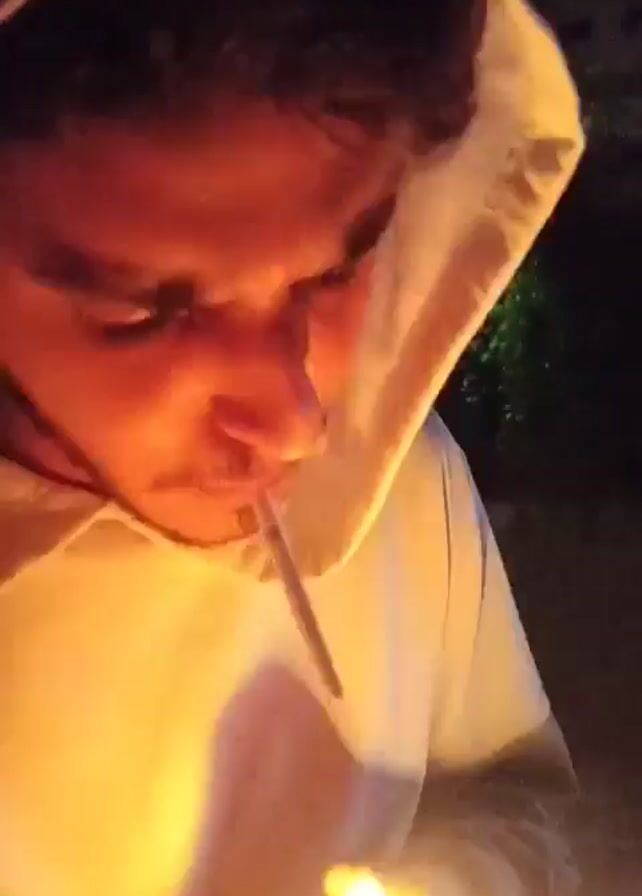 A young adult with a dark beard and a hoodie lights a cigarette with a lighter in the dark. The flame illuminates his face as he takes a drag.