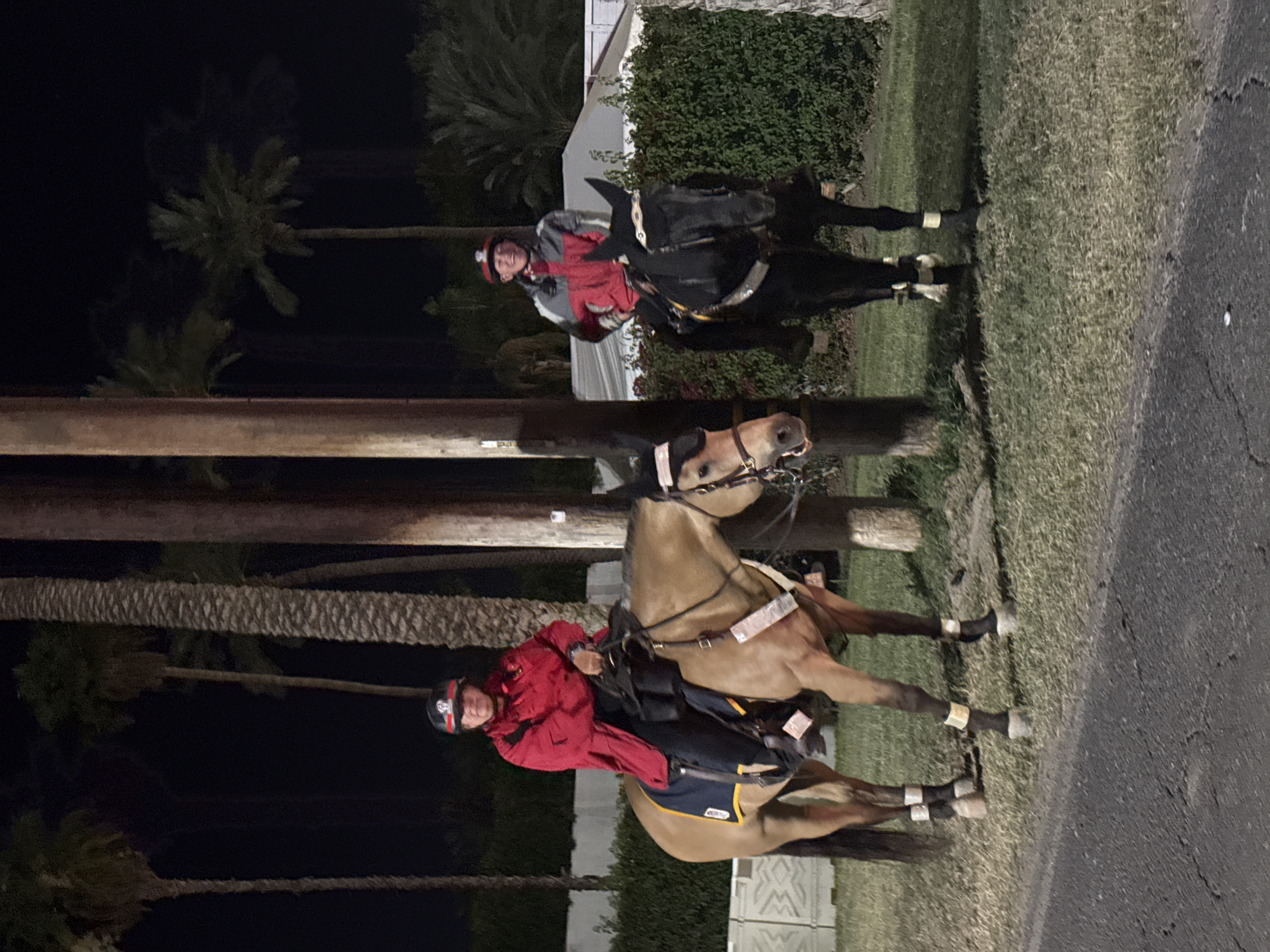 The photograph depicts two individuals on horseback in an outdoor environment at night. One rider is wearing a red jacket and a helmet and is mounted on a light brown horse equipped with a saddle and bridle. The second rider, also wearing a red jacket and helmet, is on a black horse. The horses are standing on a grassy area adjacent to a paved road. Palm trees are visible in the background, indicating a desert environment. The presence of white fencing and trimmed hedges suggests a residential or commercial area. The location is suspected to be in the city of La Quinta, United States of America.