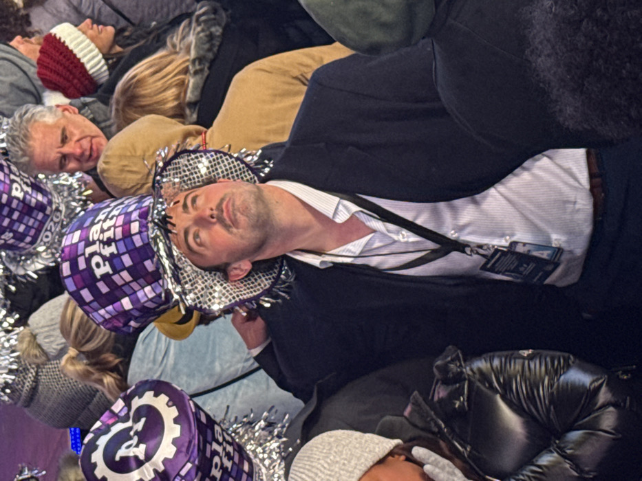 A group of people is gathered, several wearing festive New Year's hats. One man in a dark suit and light shirt is wearing a silver fringe hat and has a lanyard around his neck. To his left, another man looks toward the camera. Other people around them wear winter hats and jackets. Purple hats with a gear logo are scattered among the crowd, adding to the celebratory atmosphere.