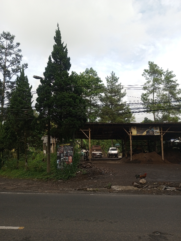 A roadside scene with tall trees lining the foreground. An open-sided structure with a roof shelters two vehicles and a pile of material, possibly soil or gravel. A sign with photos is visible next to the trees. A rooster stands on a rock near the edge of the road, amidst some debris. The sky is overcast, creating a soft, diffused light over the entire scene.