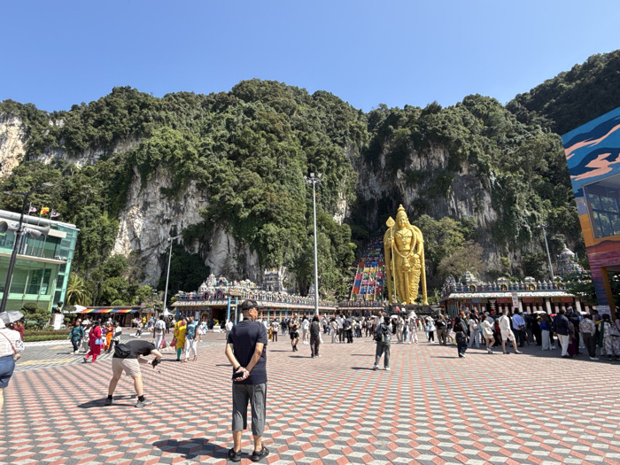 A wide shot shows a crowd of people milling about in front of the Batu Caves temple complex in Malaysia