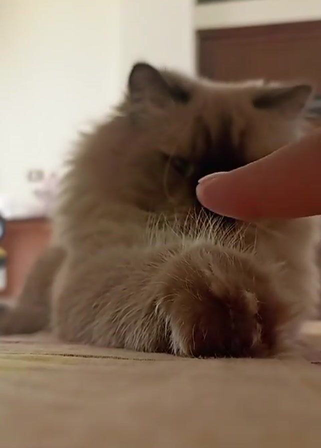 fluffy, light-brown cat lying on a tan surface, possibly a carpet or blanket. The cat is facing the camera, and its face is somewhat obscured by its fur. A person's finger reaches out and touches the cat's paw. The background is blurred, but appears to be an indoor setting with furniture and a window.