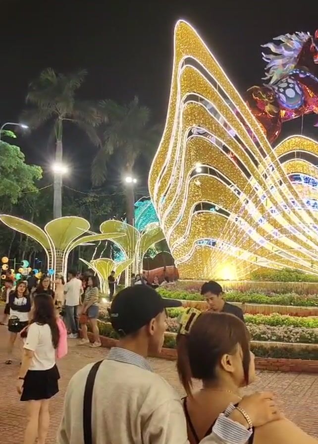A couple stands in a park at night, looking at a large, illuminated display. The display features a golden, shell-like structure, a rearing horse figure, and blue lighting. Other people are walking around in the background. The woman raises her phone to take a picture of the display. The man has his arm around her shoulder. Palm trees and streetlights are visible in the background. The park is paved with brick.